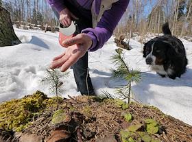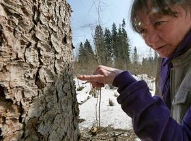 Местная жительница Катерина Жакова у погибших от насекомых деревьев, в сосновом бору поселка…
