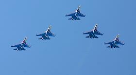 Самолеты пилотажных групп "Стрижи" и "Русские витязи" во время выступления с показательной…