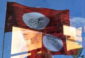 Первомайская демонстрация на Невском проспекте. Отражение красных флагов в витрине магазина женского…