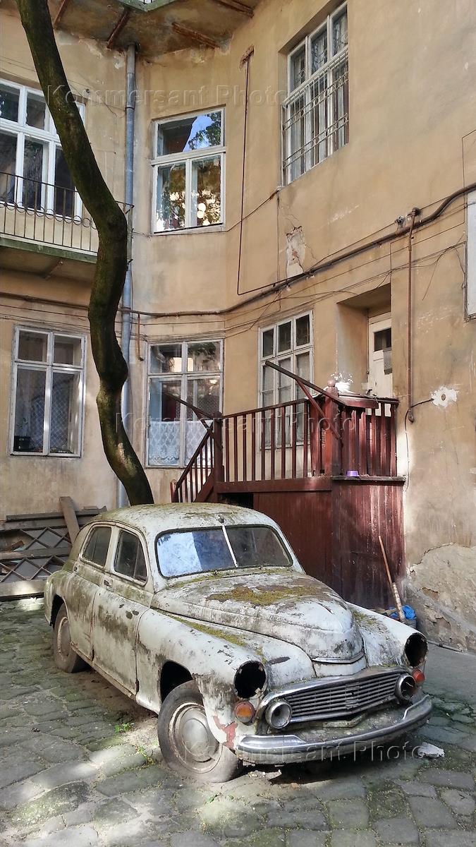 Виды Львова. Старый автомобиль во дворе жилого дома.