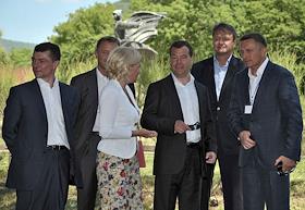 Председатель правительства России Дмитрий Медведев (справа) во время посещения Всероссийского…