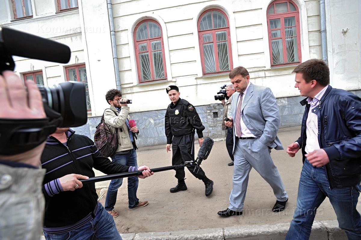 Губернатор Кировской области Никита Белых (в центре) после судебных слушаний по делу председателя…