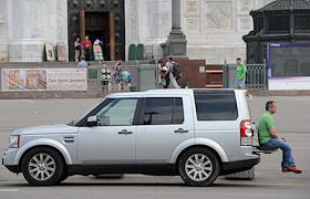Виды Москвы. Мужчина сидит на дверце багажника автомобиля Range Rover (Рэндж Ровер) на улице…