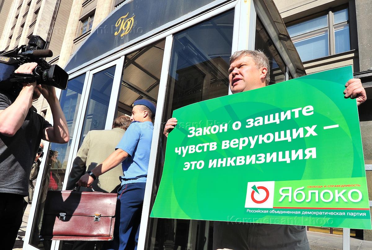 Политика Серия одиночных пикетов против законопроекта о защите религиозных чувств верующих активистов партии «Яблоко» во главе с ее лидером Сергеем Митрохиным у здания Государственной Думф РФ.