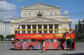 Виды Москвы. Красный автобус у здания Государственного Академического Большого театра.