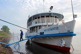 Река Енисей. Пассажирский дизель-электроход "М.Ю.Лермонтов" (постройки 1957 г.) причален у…