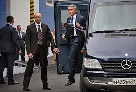 Президент Республики Башкортостан Рустэм Хамитов (справа) на предприятии ОАО "ПОЛИЭФ" компании…