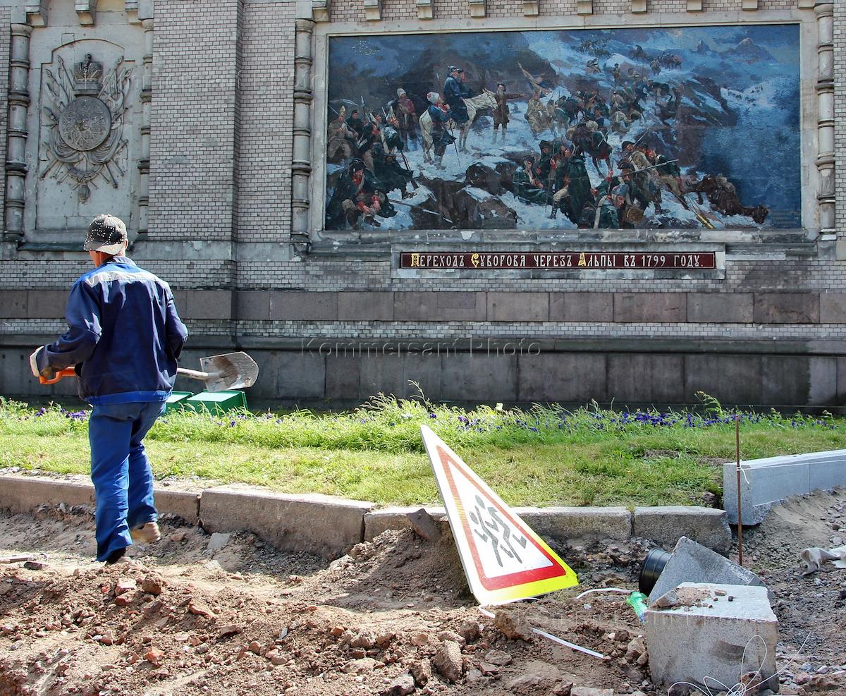 Дорожные работы по устройству гранитного тротуара на Кирочной улице у здания музея полководца…