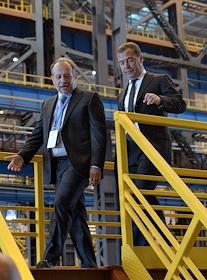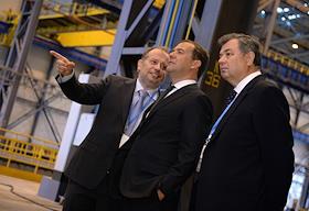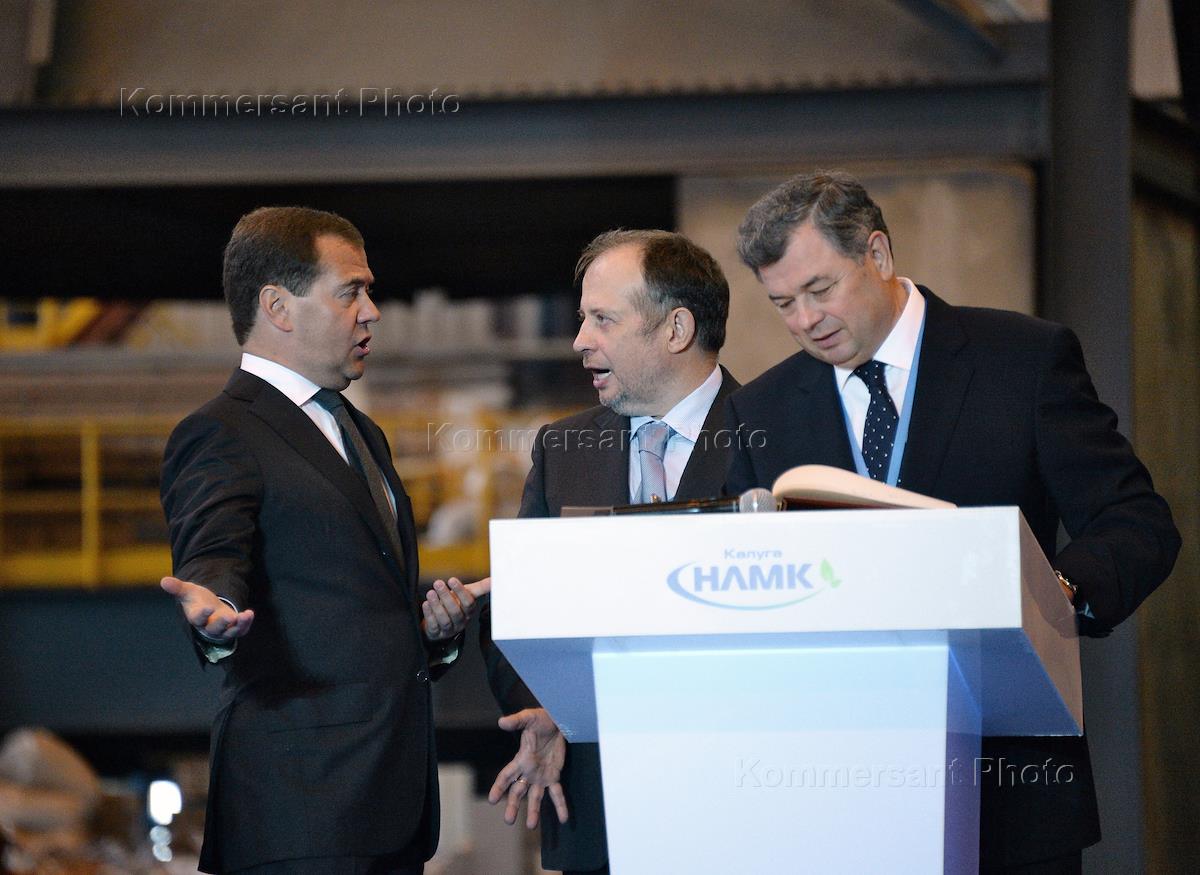 Экономика и бизнес Рабочая поездка Председателя Правительства РФ Дмитрия Медведева в Калужскую область. Медведев на церемонии открытия в Калужской области нового завода ООО "НЛМК-Калуга" по производству стали и сортового проката строительного назначения.