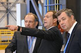 Председатель правительства России Дмитрий Медведев (справа) во время посещения нового…