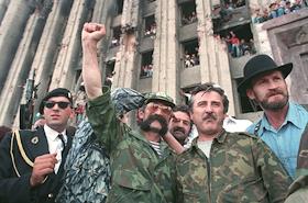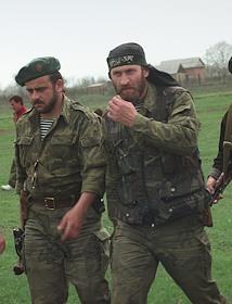 Полевые командиры Казбек Махашев (второй справа) и Ахмед Закаев (справа) во время первой чеченской…