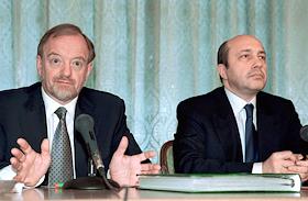 Министры иностранных дел: Великобритании Робин Кук (слева) и России Игорь Иванов (справа) отвечают…