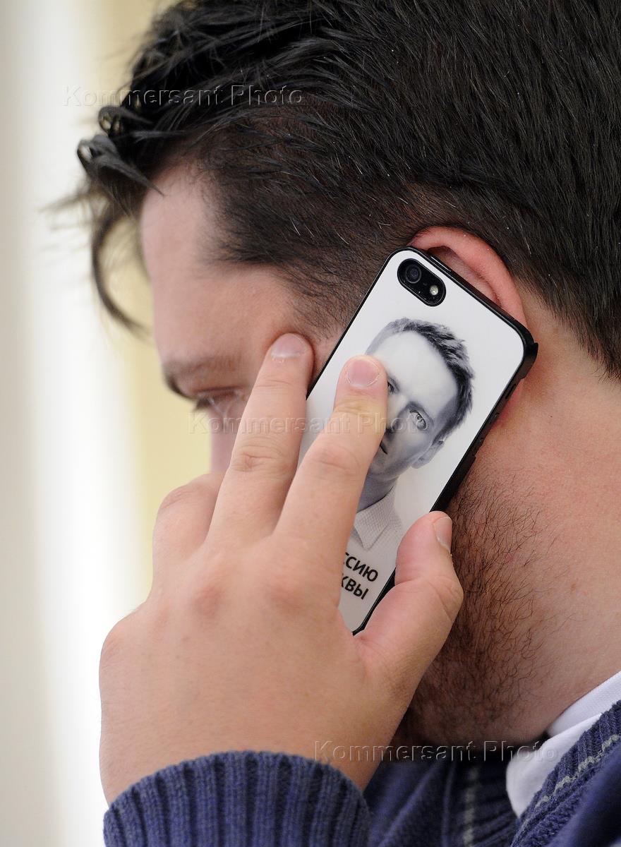 Жанровая фотография. Мужчина говорит по мобильном телефону. Портрет Алексея Навального на чехле…