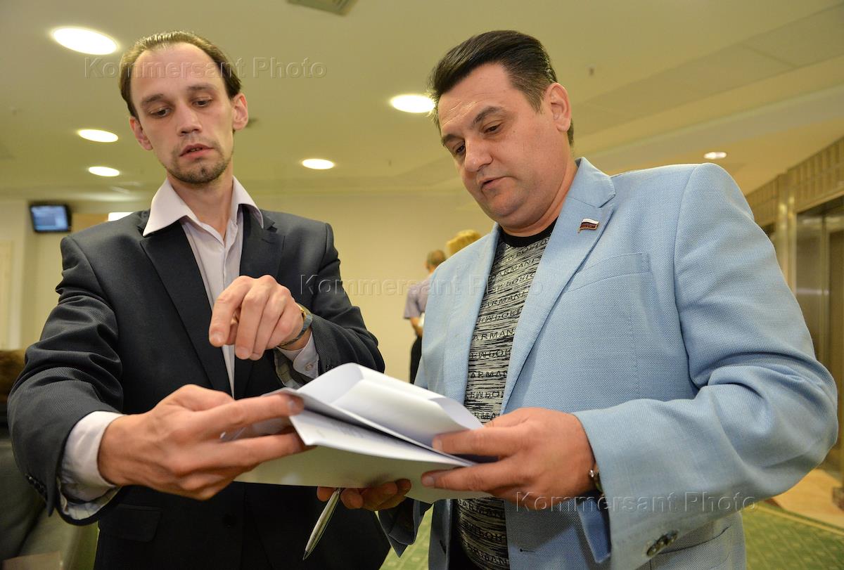 Депутат Государственной думы России от партии "Справедливая Россия" Олег Михеев (справа) во время…