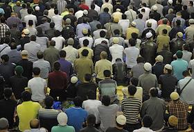 Праздник разговения Ураза-байрам. Верующие во время молитвы в павильоне №2 парка "Сокольники".