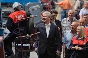 Исполняющий обязанности мэра Москвы Сергей Собянин (слева) во время посещения строительной компании…