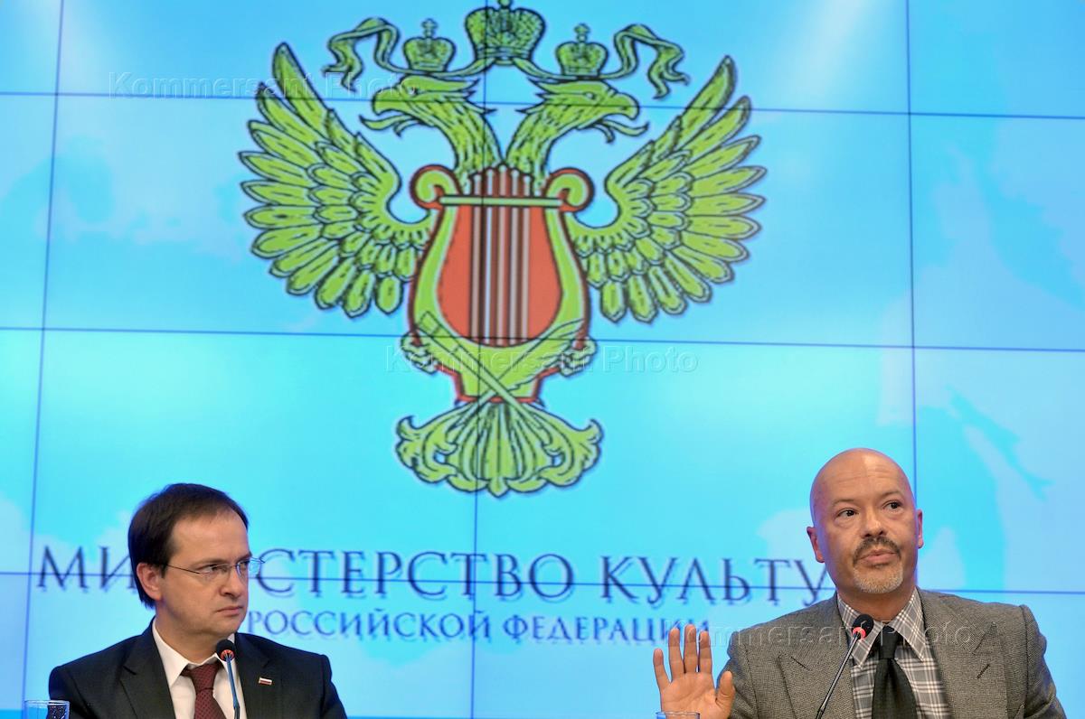 Министр культуры России Владимир Мединский (слева) во время пресс-конференции на тему "День…