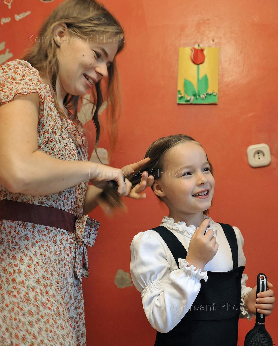 День знаний. Первоклассница с мамой готовится к выходу в школу.