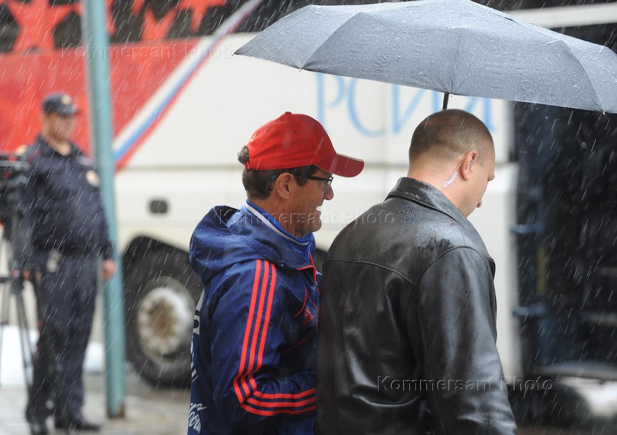 Главный тренер сборной России по футболу Фабио Капелло (слева) перед началом тренировки сборной…
