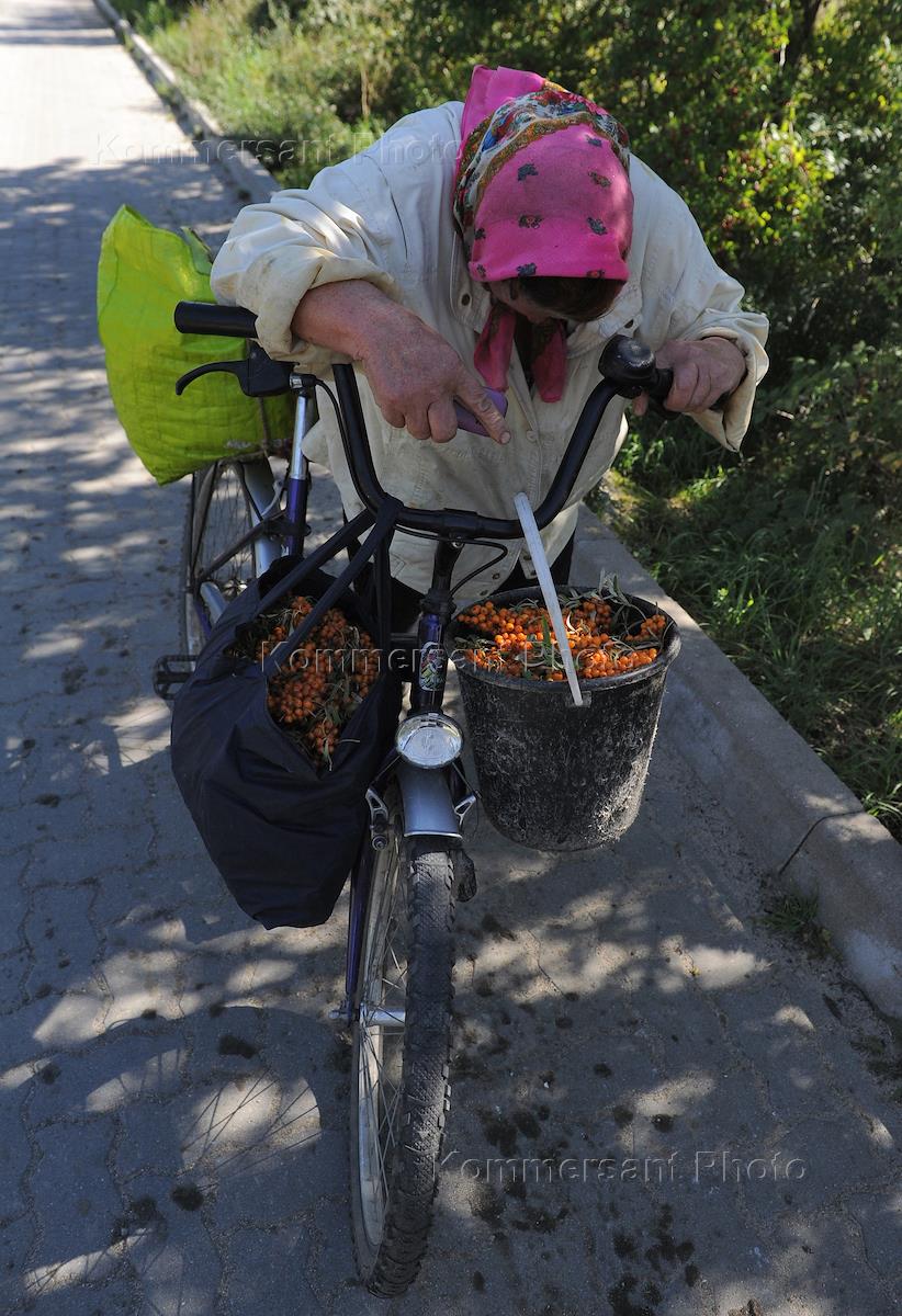 Жанровая фотография. Женщина на велосипеде везет в ведрах, собранную облепиху.