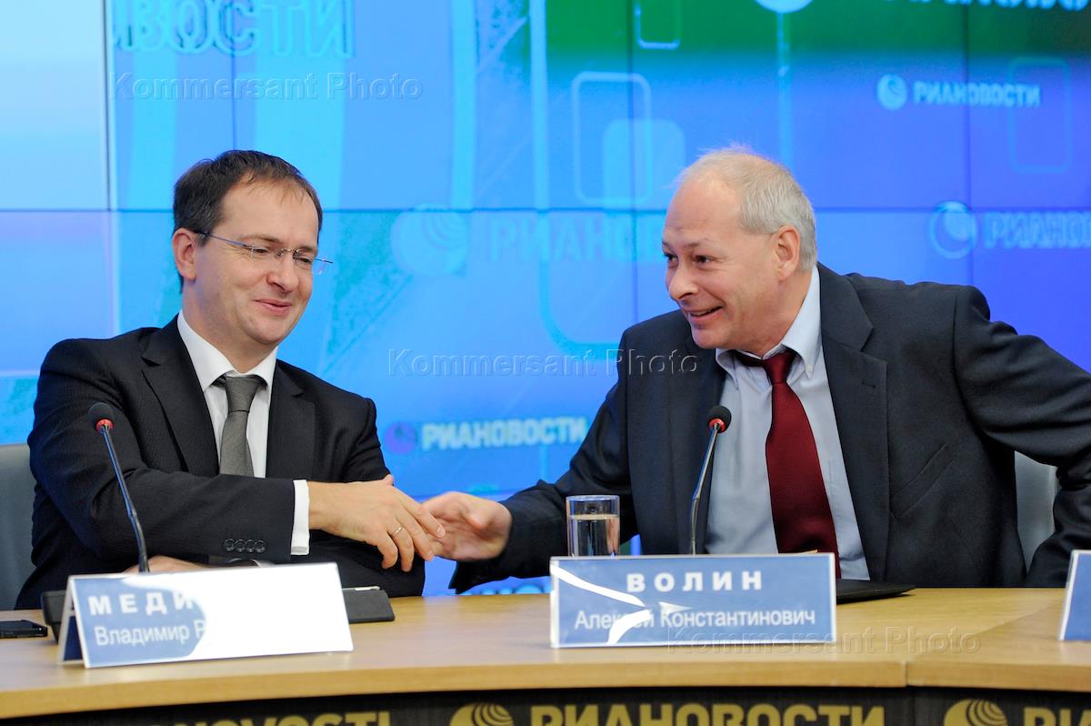 Министр культуры России Владимир Мединский (слева) и заместитель министра связи и массовых…
