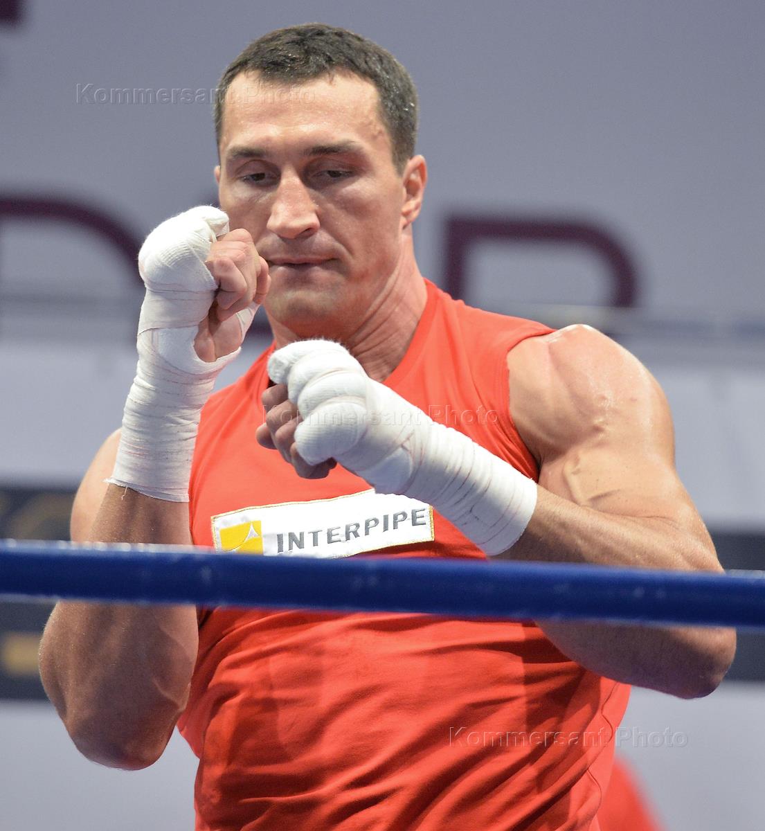Боксер, чемпион мира в супертяжелом весе по версиям IBF и WBO Владимир Кличко (слева) во время…