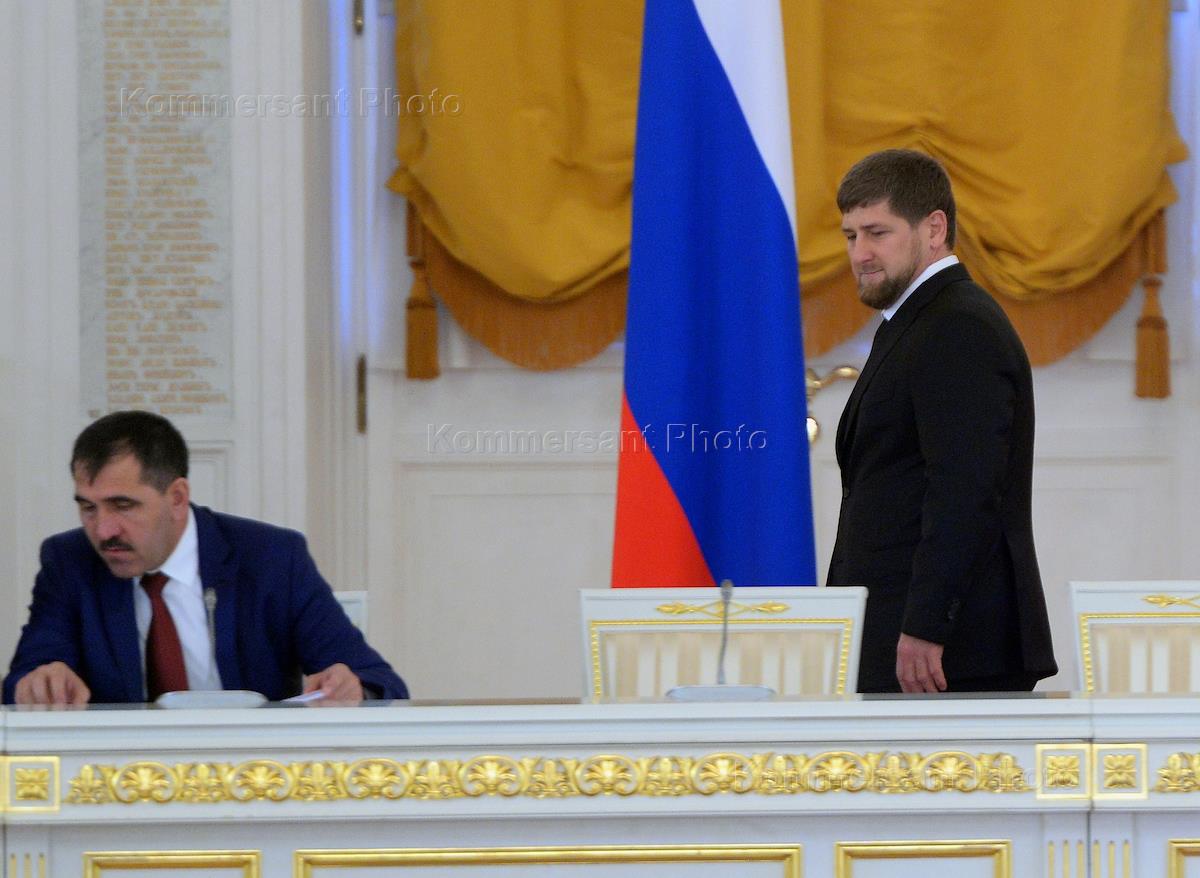 Президент Ингушетии Юнус-Бек Евкуров (слева) и глава Чеченской Республики Рамзан Кадыров (справа) на…