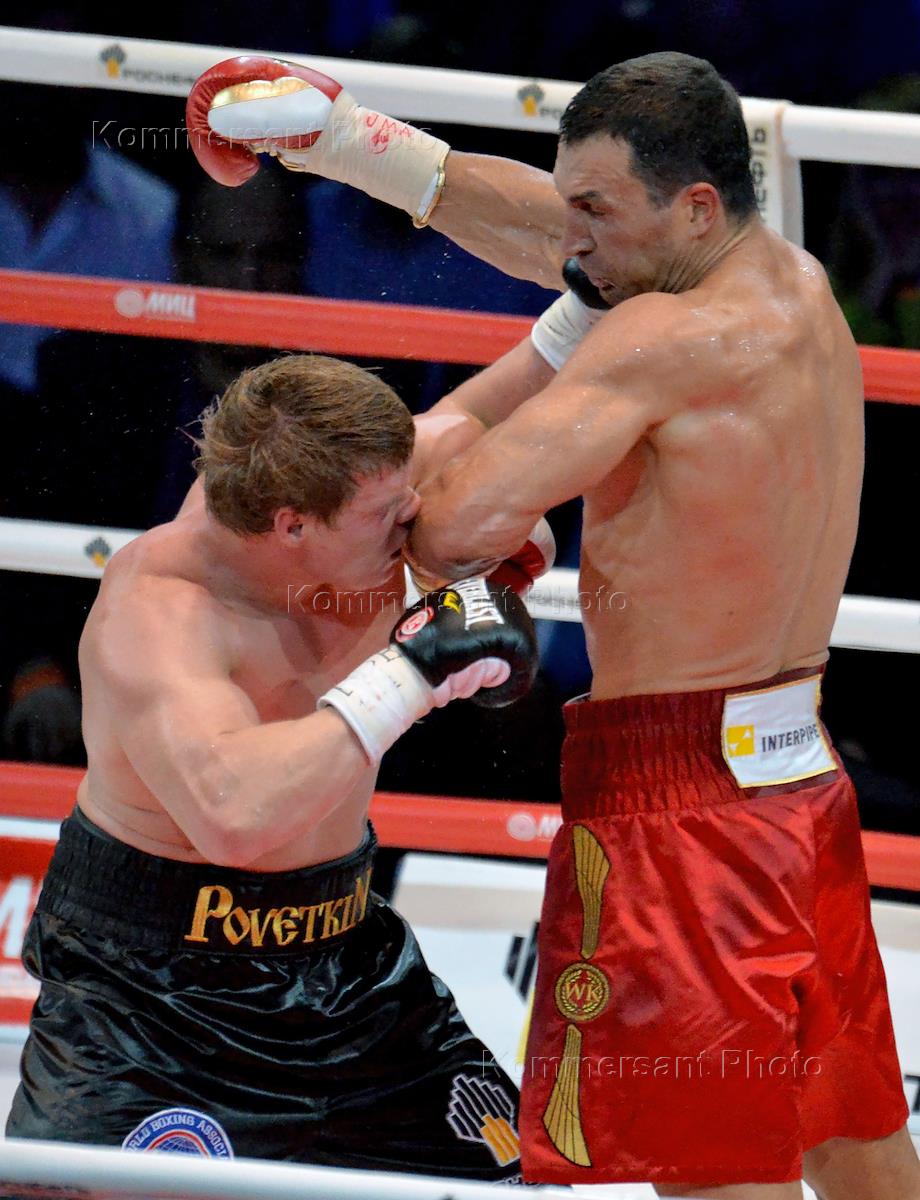 Боксерское шоу "Кличко VS Поветкин". Чемпион WBA Александр Поветкин во время боя с боксером,…