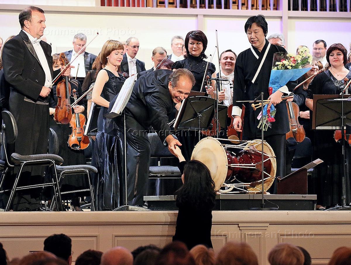 Культура Открытие II Международного музыкального фестиваля "Евразия". Уральский филармонический оркестр под управлением главного дирижера Дмитрия Лисса. Уи Сик Ким испльнитель на традиционном корейском барабане чанггу. Скрипач Сергей Крылов. на сцене Свердловской филармонии.