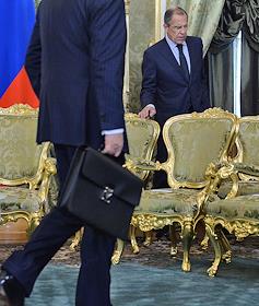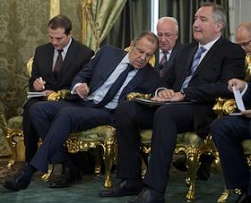 Президент России Владимир Путин (слева), министр иностранных дел России Сергей Лавров (в центре),…