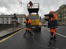 Последствия шторма “Святой Иуда” на Стрелке Васильевского острова. Обрыв троллейбусных проводов на Аничковом мосту.