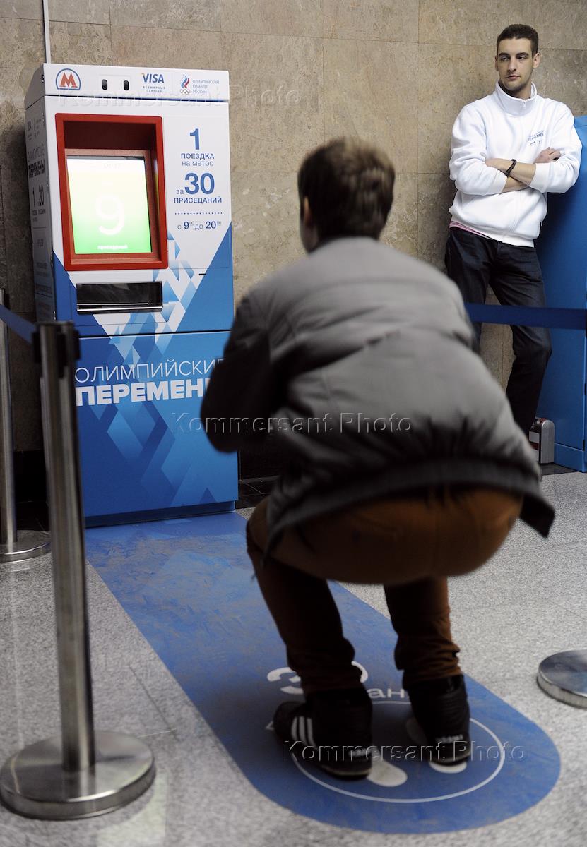 Автомат, выдающий билет на 1 поездку в московском метро за 30 приседаний, на станции метро "Выставочная".
