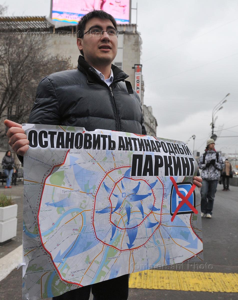 Участник акции автомобилистов против расширения зоны платной парковки с плакатом "Остановить…