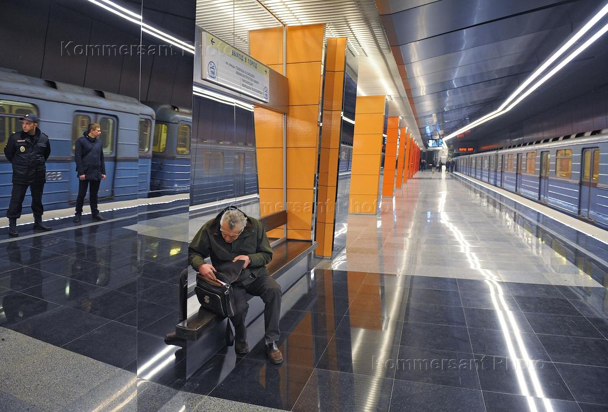 Сотрудник правоохранительных органов и пассажиры на платформе новой станции "Жулебино"…