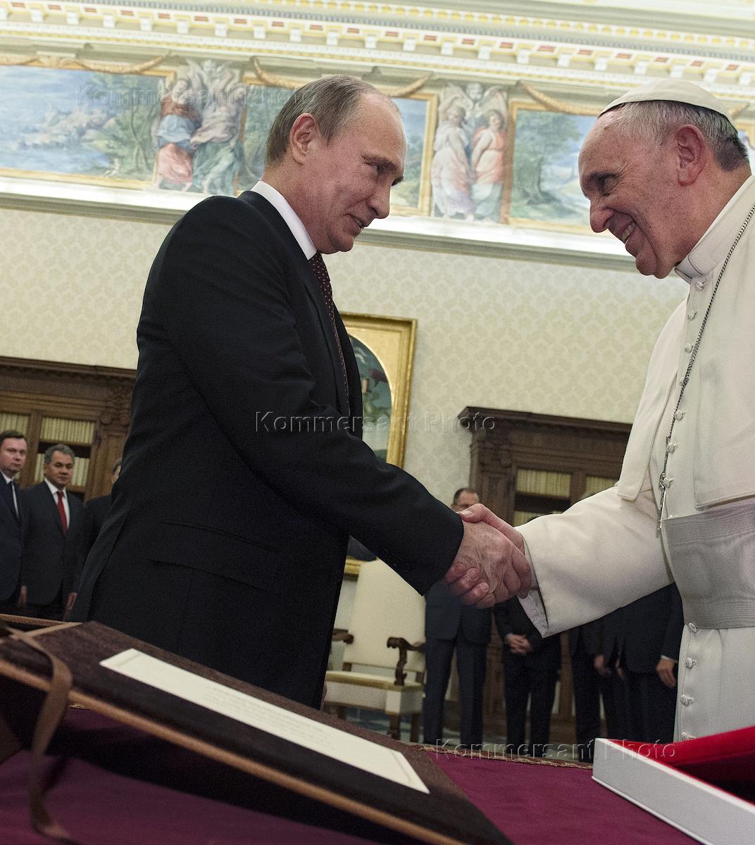Президент России Владимир Путин (слева) и Папа Римский Франциск (справа) во время официальной…