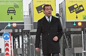 Предесдатель правительства России Дмитрий Медведев во время осматра новой автодороги "Новый выход на…