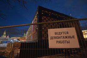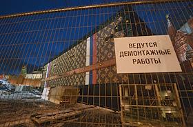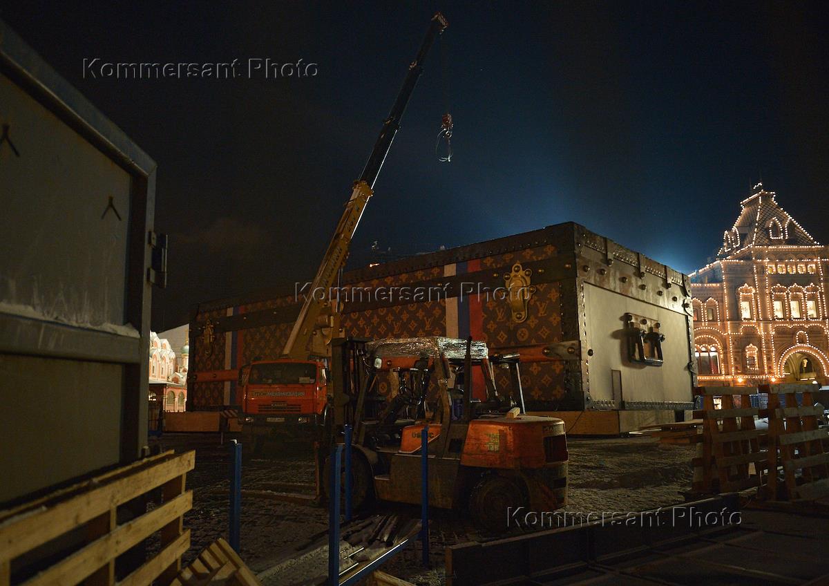 Демонтаж павильона "Душа странствий" (так называемый "Чемодан Louis Vuitton") на Красной площади.