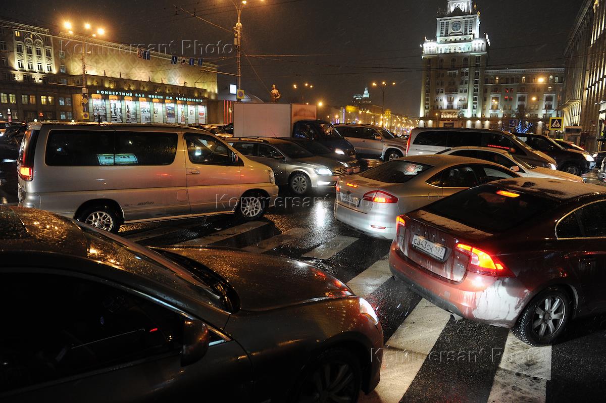 Снег и гололед на улицах Москвы. Дорожное движение на улицах города, автомобильные пробки