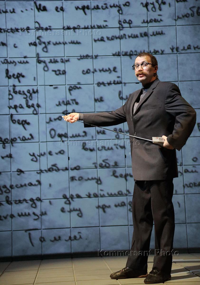 Художественный руководитель Государственного театра наций Евгений Миронов (на экране) в спектакле…