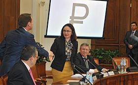 Официальная презентация нового знака рубля в Центральном банке РФ.