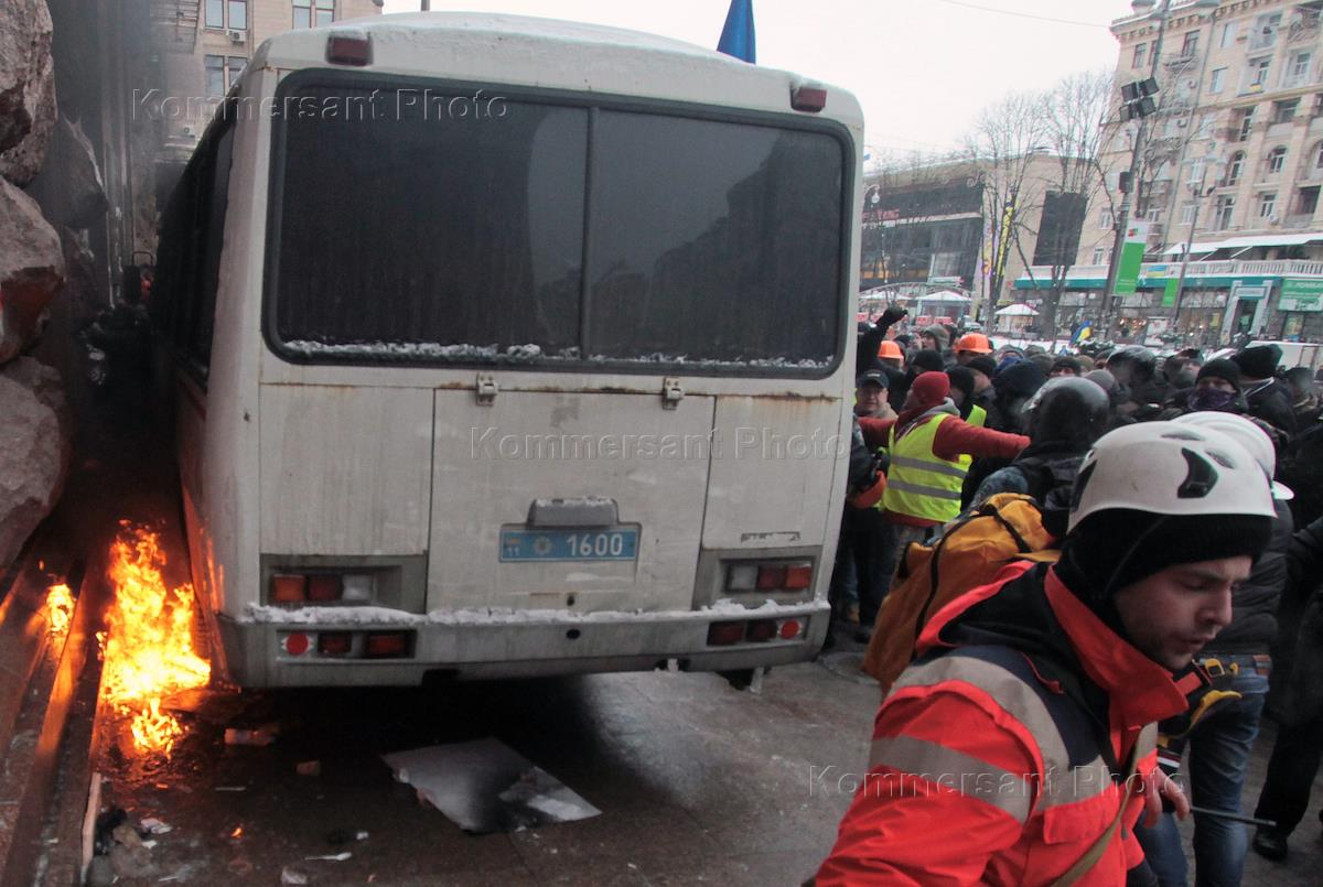 Евромайдан. Акции сторонников евроинтеграции Украины. Подожженный автобус подразделения милиции…