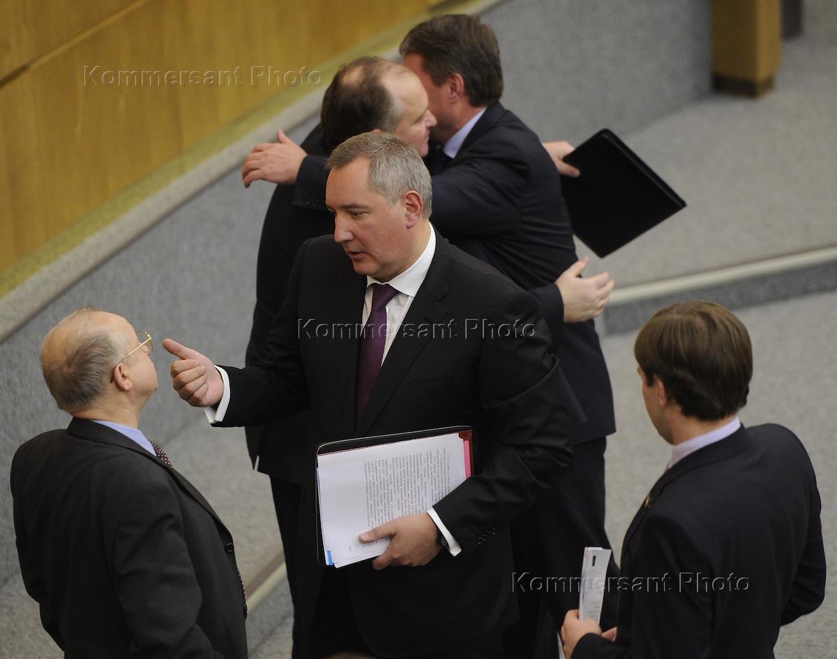 Заместитель председателя правительства России Дмитрий Рогозин (в центре) на пленарном заседании…