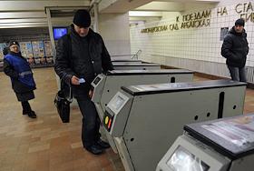 Московское метро. Пассажири при проходе через турникеты.