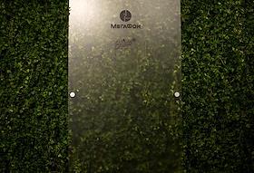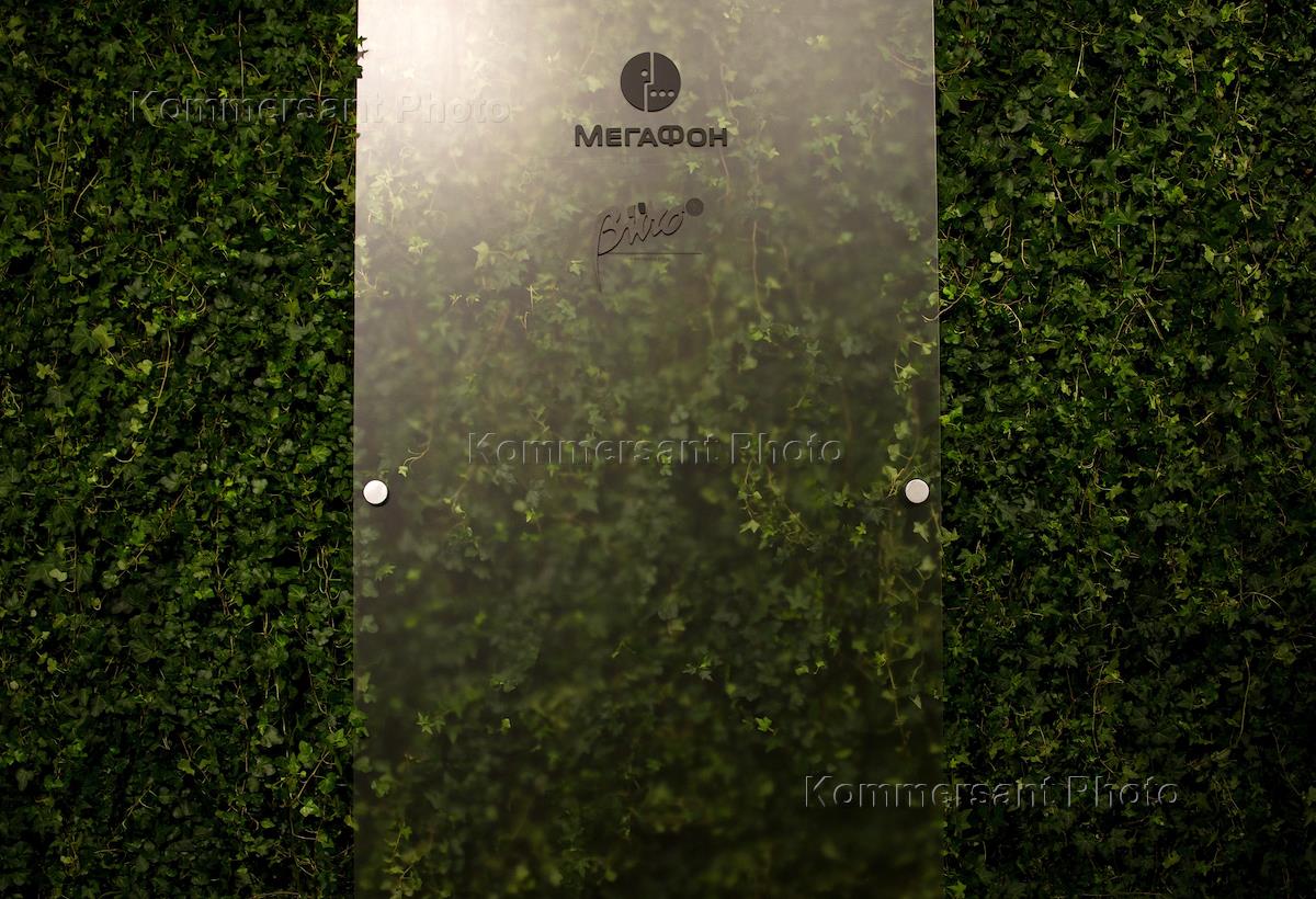 Рекламный стенд с логотипами оператора сотовой связи "Мегафон" и интернет-сайта "Buro 24/7" в Центре…
