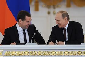 Председатель правительства России Дмитрий Медведев (слева) и президент России Владимир Путин…