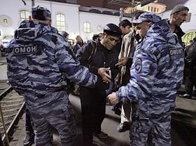Сотрудники ОМОНа во время проверки документов у пассажиров поезда "Москва-Ташкент" на Казанском…