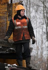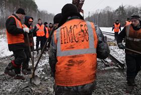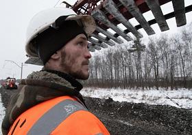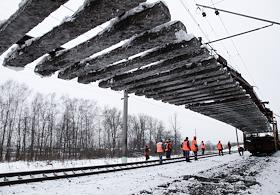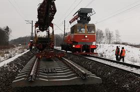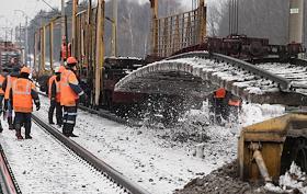 Рабочие на железнодорожных путях во время укладки участка дороги.