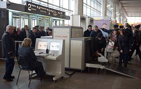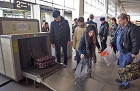 Жанровая фотография. Виды Курского железнодорожного вокзала. Пассажиры во время проверки багажа.