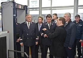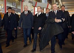 Экономика и бизнес Посещение председателем правительства России Дмитрием Медведевым, мэром Москвы Сергеем Собяниным и президентом ОАО "Российские железные дороги" (РЖД) Владимиром Якуниным Курского вокзала г. Москвы. Проверка систем безопасности на железнодорожном транспорте.
