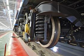 Колеса электропоезда на рельсах в электродепо Братеево.